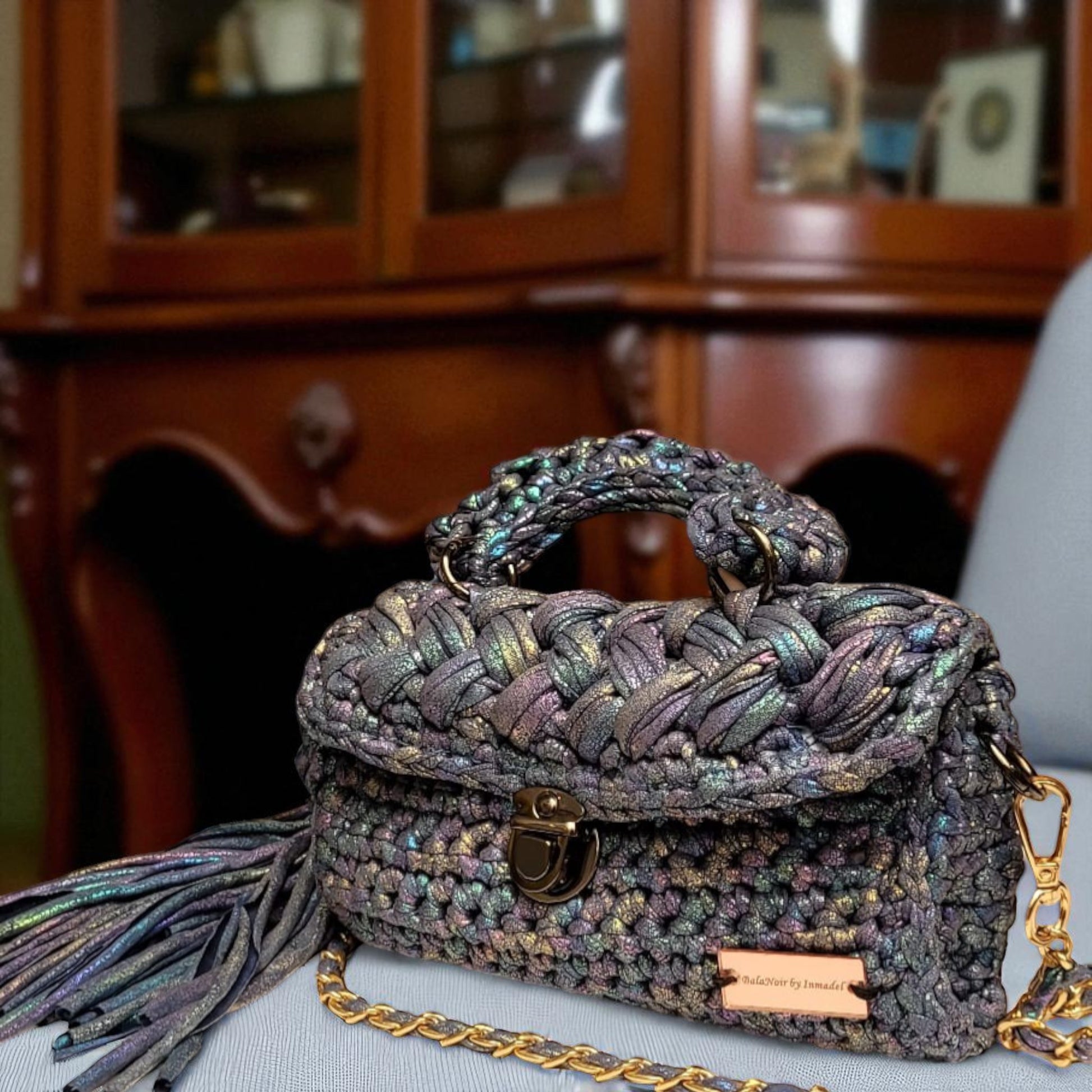 Bolso de trapillo color azul brillante tejido a mano con punto pluma, forrado por dentro con tela estampada de algodón, correa metálica dorada y aplique de borla metalizada al tono todo desmontable.