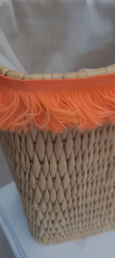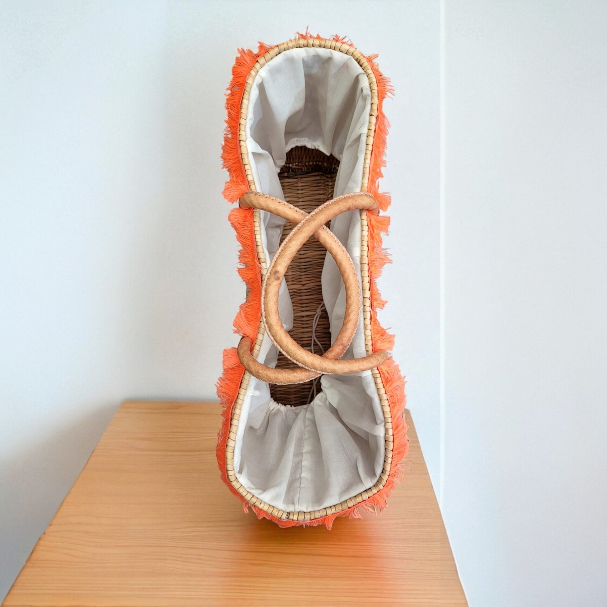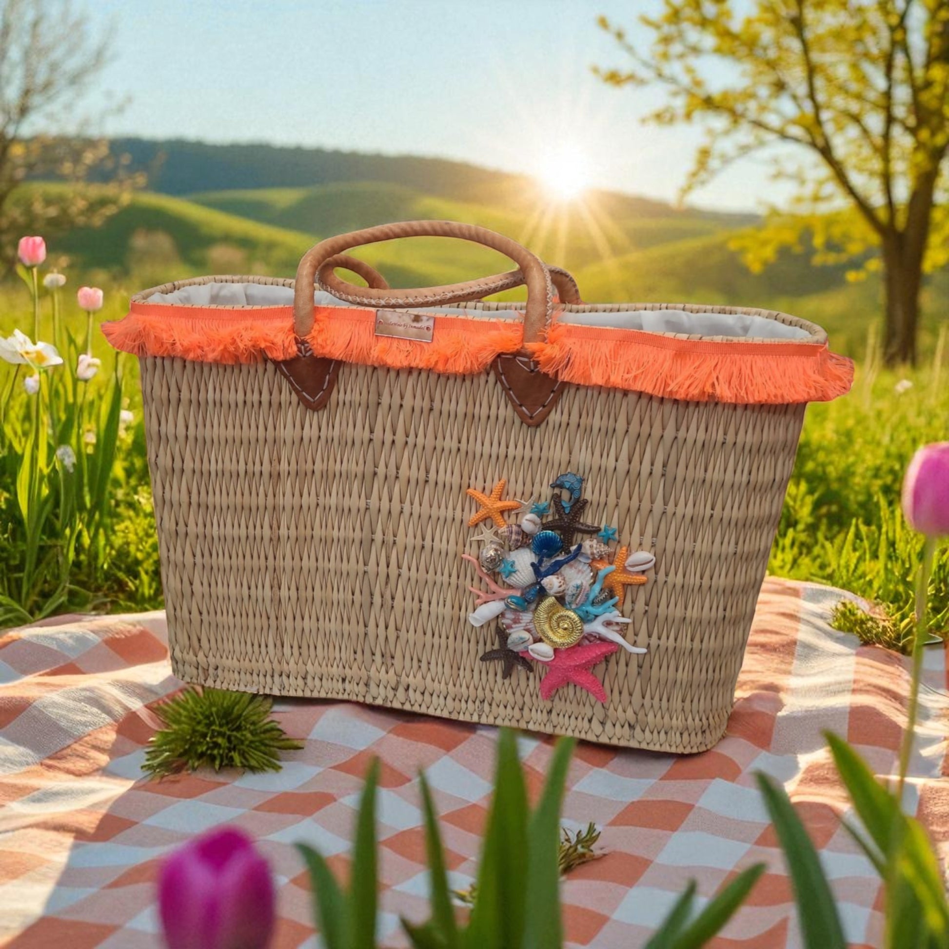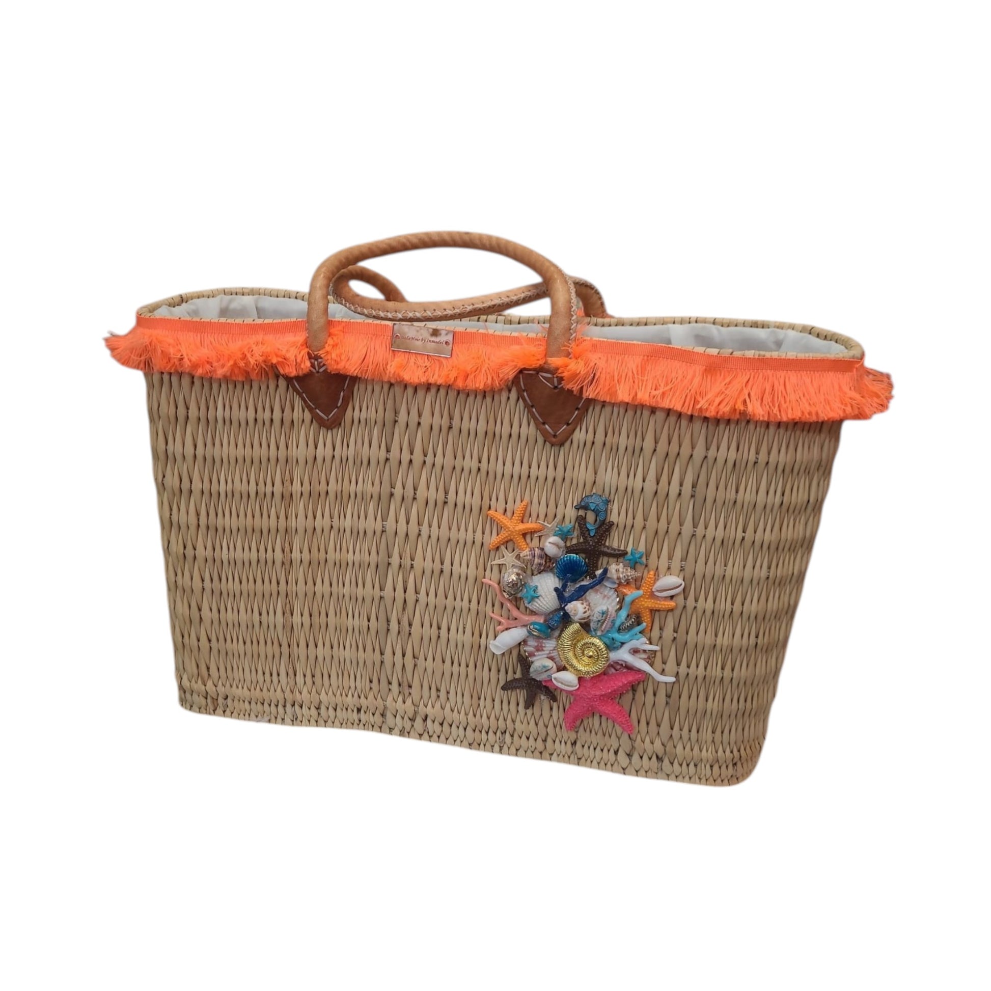 Exclusiva y amplia cesta tejida en color trigo con diseño de estrellas, caracolas y conchas en colores, asas forradas en piel y galón naranja brillante. Ideal para llevar todo lo que necesites a tu día de playa o campo.