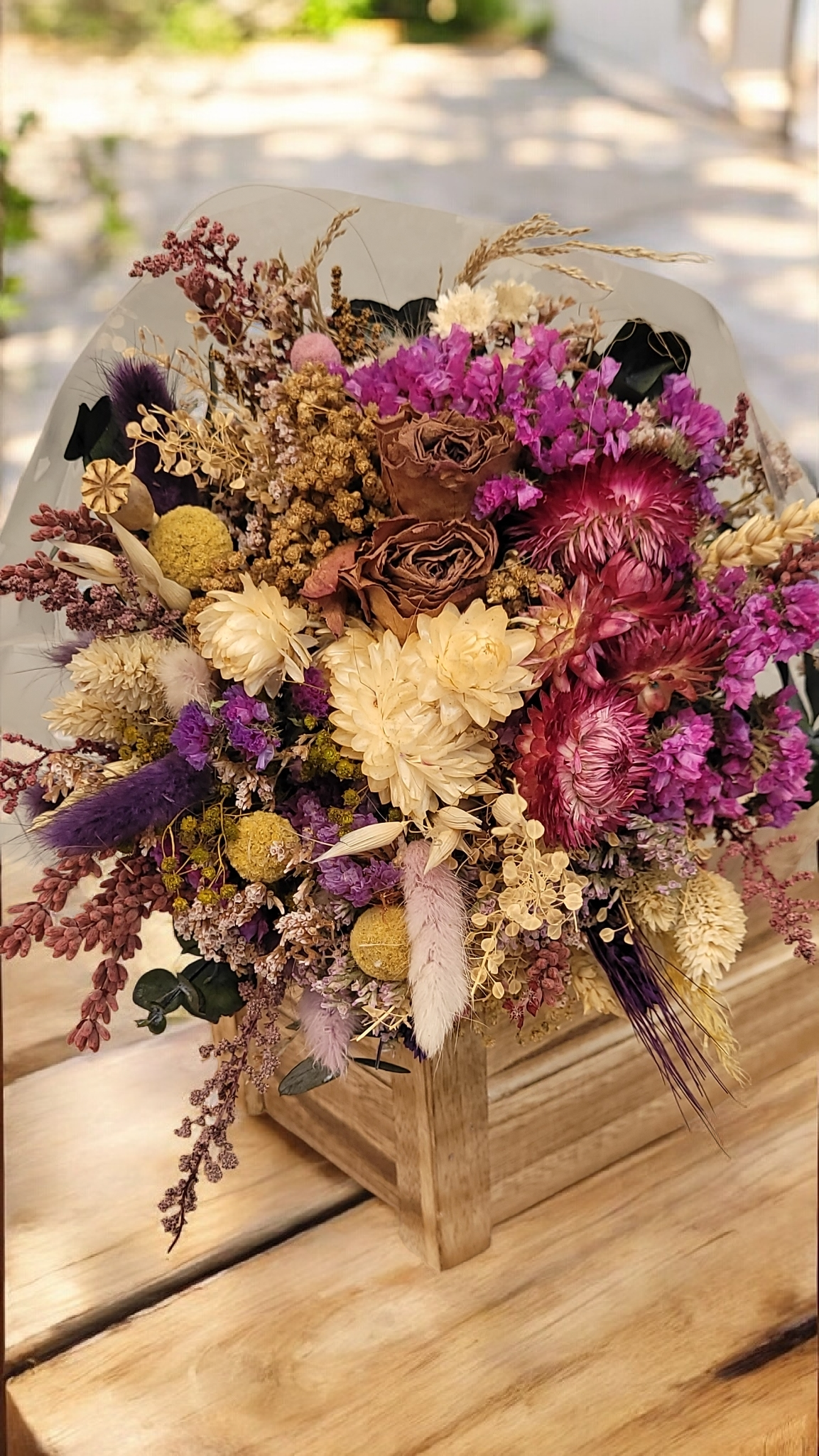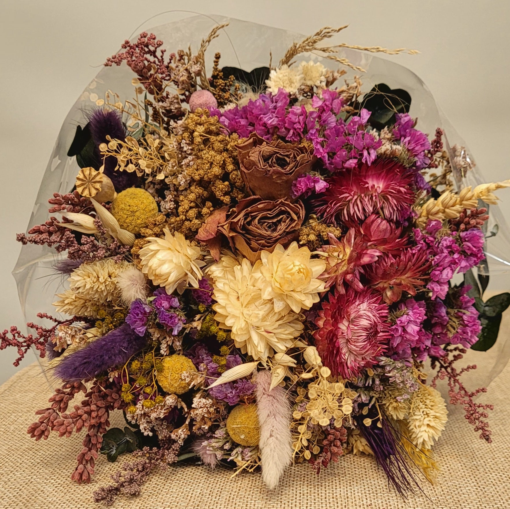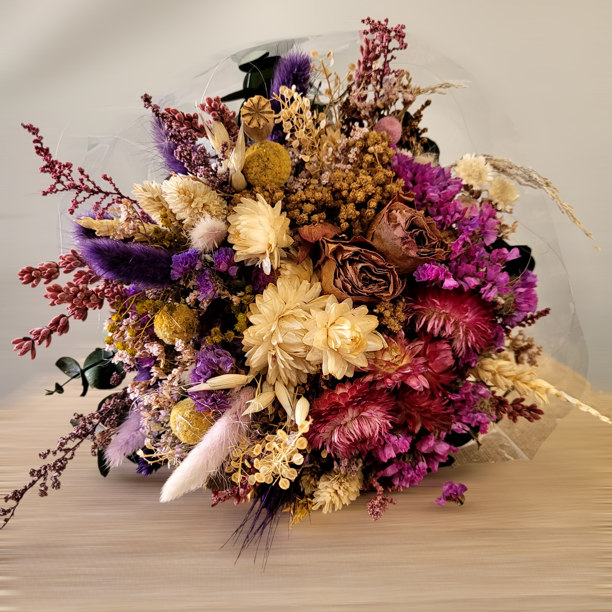 Al tratarse de flores naturales secas y preservadas, cada ramo es ligeramente diferente.